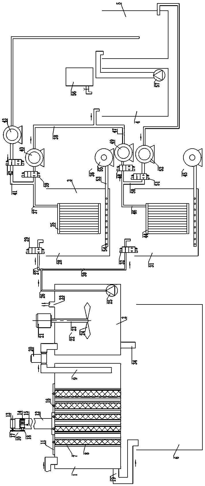 • 線反沖洗式養(yǎng)殖污水處理設(shè)備,包括過濾池、厭氧池、膜生物反應(yīng)池、消毒池、清水池和污泥池。過濾池中設(shè)有若干個格柵板,過濾池上設(shè)有用于提升格柵板的提升裝置,便于維護格柵