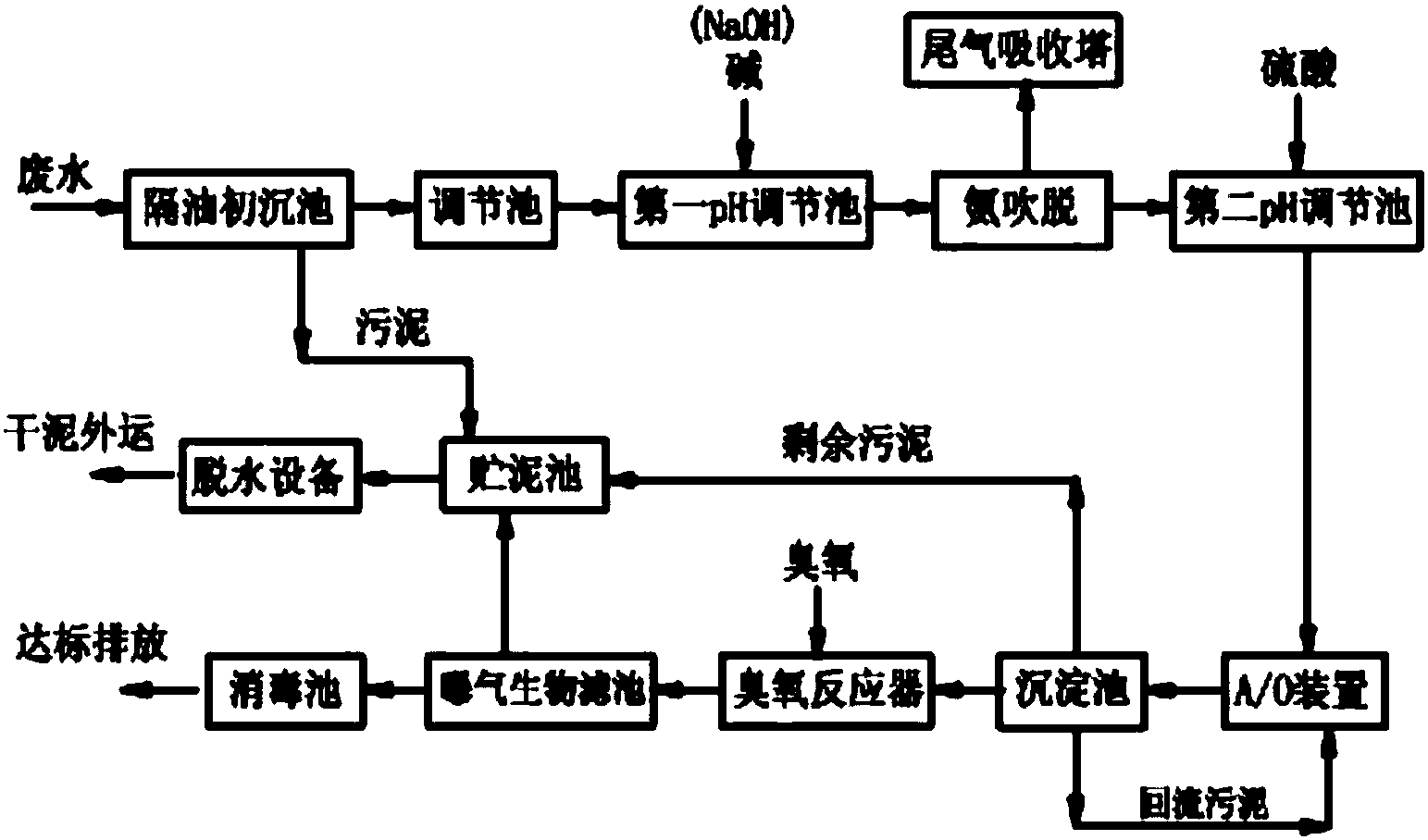 種餐廚垃圾廢水處理方法,用于餐廚垃圾漿料厭氧發(fā)酵脫水后的廢水及餐廚垃圾處理其它工序所產(chǎn)生廢水的處理方法。廢水先后經(jīng)隔油初沉、水量水質(zhì)調(diào)節(jié)、pH值第一次調(diào)節(jié)、氨吹脫塔