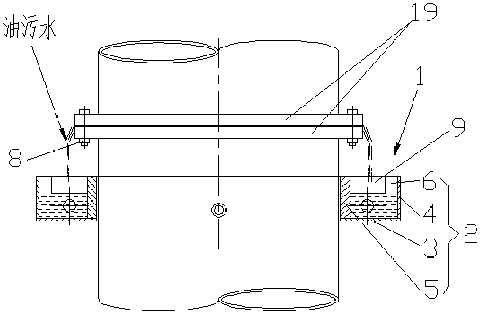 本發(fā)明涉及船舶管道維修工藝裝備技術(shù)領(lǐng)域,具體涉及一種管內(nèi)油污水收集裝置,包括一對(duì)采用哈夫?qū)咏Y(jié)構(gòu)的半環(huán)形污水收集槽,每一半環(huán)形污水收集槽包括作為槽底的半環(huán)形底板、