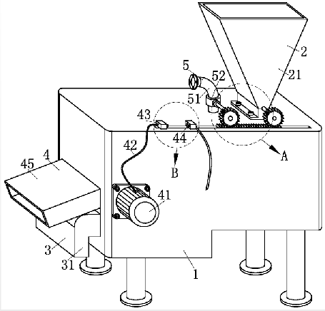 4.根據(jù)權(quán)利要求2所述的一種定量加藥組件便于拆卸的污水處理裝置,其特征在于:所述清理結(jié)構(gòu)(4)包括電機(41)、電線(42)、插頭(43)、插座(44)、出料管(45)、轉(zhuǎn)桿(46)和清理刷(47),所述電機(41)固定于所述箱體(1)的外部側(cè)壁上,在所述箱體(1)的內(nèi)部轉(zhuǎn)動所述轉(zhuǎn)桿(46),且所述轉(zhuǎn)桿(46)與所述電機(41)固定連接,在所述轉(zhuǎn)桿(46)的外部套接所述清理刷(47),在所述雙面齒條(25)的一端固定所述插頭(43),且所述插頭(43)與所述電機(41)通過所述電線(42)連接,在所述箱體(1)的頂端固定所述插座(44)。