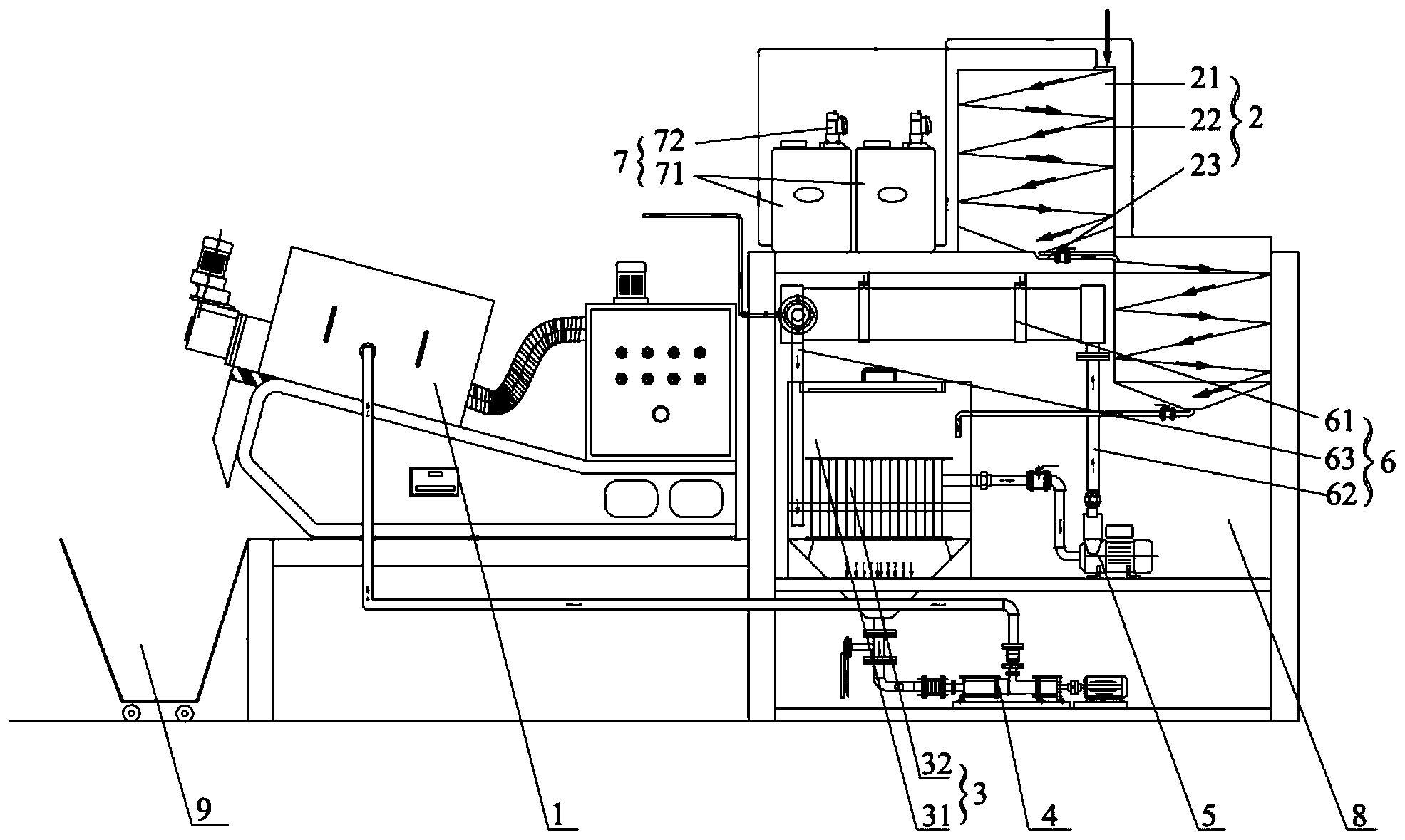 污水處理技術(shù)領(lǐng)域,具體提供了一種無(wú)動(dòng)力攪拌的污水處理設(shè)備,包括:混凝漩渦裝置包括攪拌桶、與攪拌桶連接的進(jìn)水管和出水管;攪拌桶呈圓筒狀,且內(nèi)壁設(shè)有螺旋狀的導(dǎo)槽;進(jìn)水管