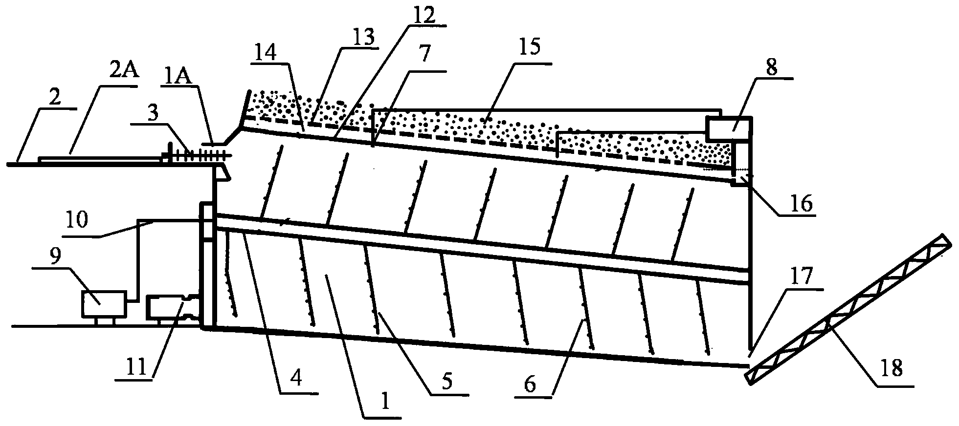 本發(fā)明公開了一種推移式污泥連續(xù)好氧發(fā)酵系統(tǒng)及其應(yīng)用方法,包括發(fā)酵倉、進(jìn)料裝置、供氣裝置、物料攪拌和推移裝置、廢氣凈化裝置及出料裝置,應(yīng)用時將待處理的污水處理剩余污