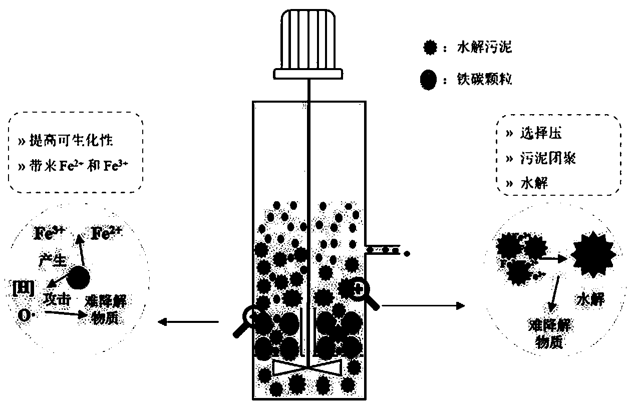 本發(fā)明公開了鐵碳和水解顆粒污泥耦合預(yù)處理難降解污水技術(shù),該工藝采用鐵碳和水解顆粒污泥耦合預(yù)處理技術(shù),具體操作步驟為在水解池內(nèi)增加固定層,固定層內(nèi)投加一定量鐵碳,水