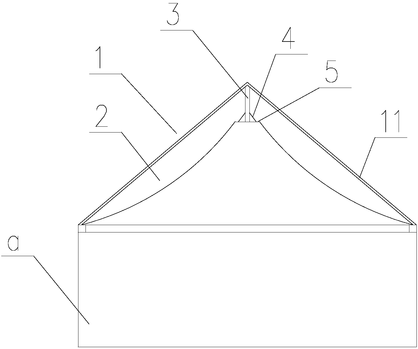 本實用新型公開了一種污水廠反吊膜密封收集裝置,包括鋼架密封蓋和吊膜,鋼架密封蓋包括至少兩個支撐臂,相鄰支撐臂的頂部連接并形成夾角,支撐臂上設有安裝桿,安裝桿的一端