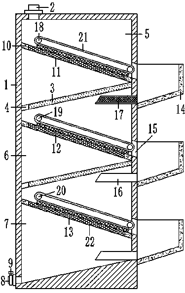 本發(fā)明公開了一種工業(yè)污水治理用污水處理裝置,包括箱體,箱體的內(nèi)腔上下兩側(cè)均固接有隔板,隔板的頂部左側(cè)開設有導流通孔,箱體的內(nèi)腔通過隔板自上而下依次分隔有初過濾室、