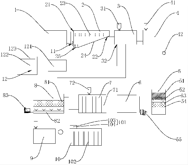 一體化污水設(shè)備供應(yīng) :本實用新型公開了一種市政污水處理系統(tǒng),包括收集池,還包括依次連通的第一沉淀池、第二沉淀池、第一回調(diào)池、復(fù)合過濾池、水解酸化池、重金屬處理池、生